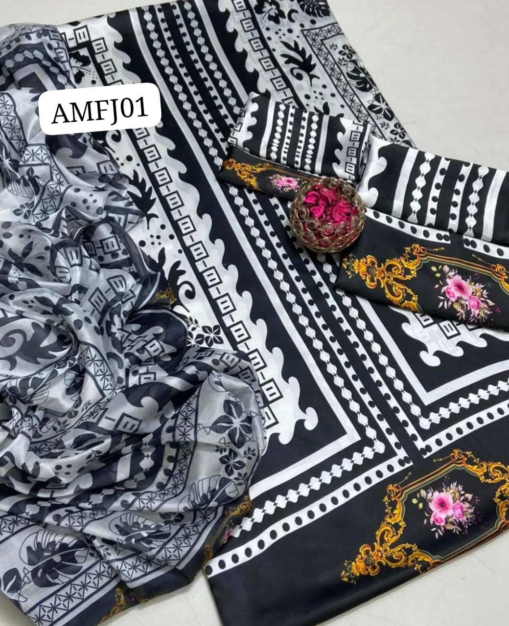 MOST #DEMANDED#🔥😍 Stuff Shamoz silk *UNSTITCHED SUITDIGITAL PRINT PREMIUM QUALITY SHAMOZE SILK SHIRT & TROUSER WITH SOFT Orignal SILK DIGITAL PRINT DUPATTA 3PC DRESS 3 Meter Shirt (Shamoz Silk)2.5 Meter Dupatta (Silk)2.5 Meter Trouser (Shamoz SIlk)