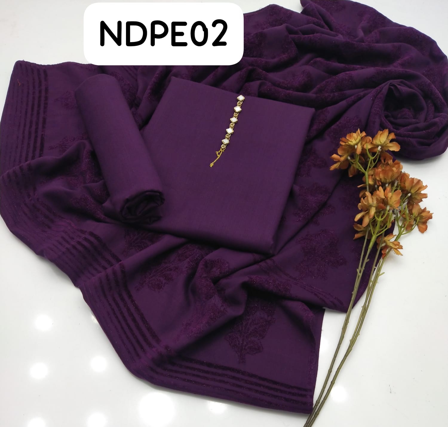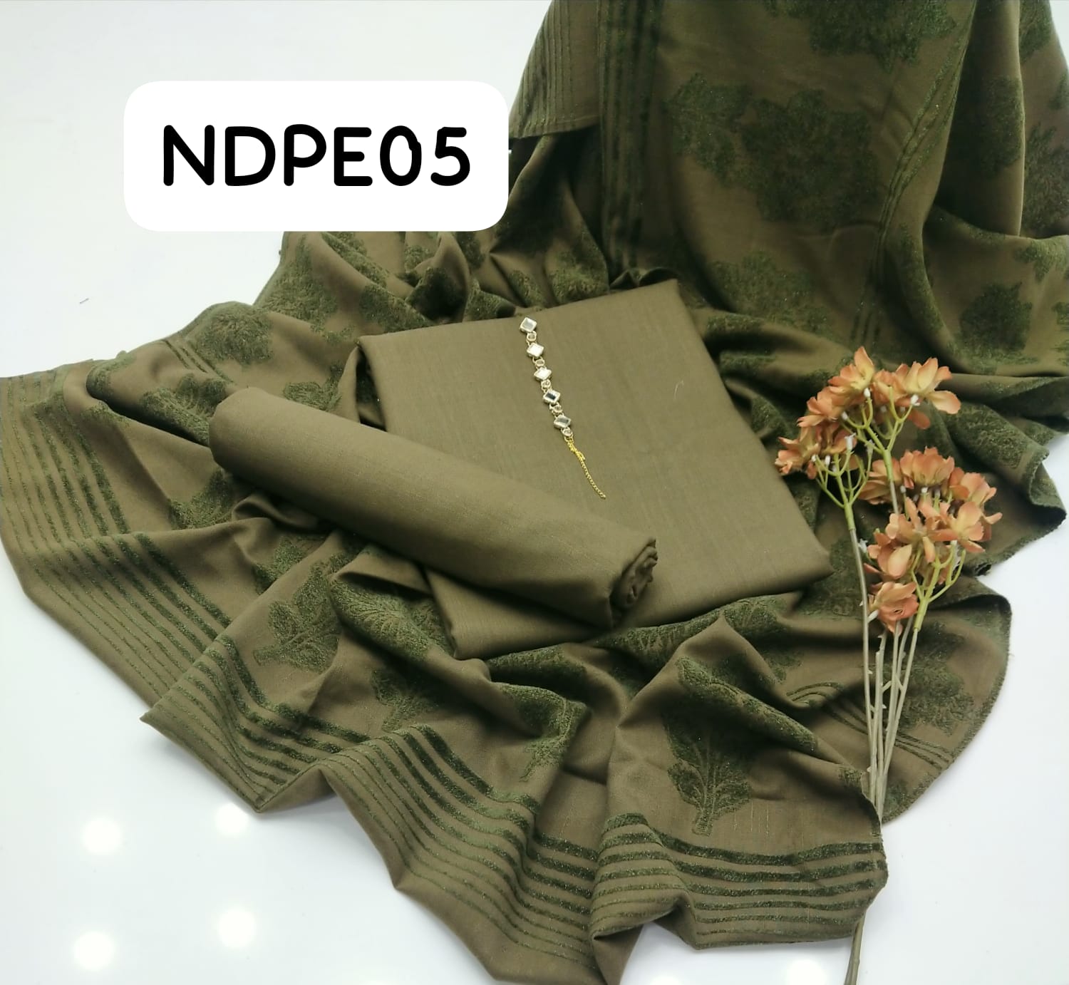 Stuff Marina wool Simple SHirt And Trouser Along WIth Wool Peach Velvet Straps Jall Style Shawl 3PC Dress
